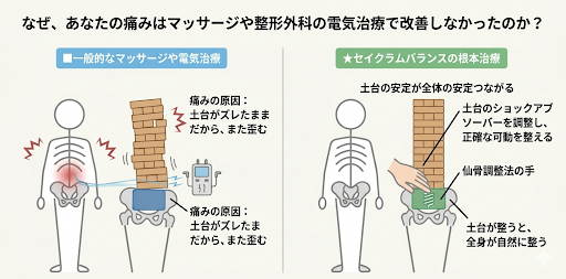 痛みがある場所を揉むだけの対症療法では、本当の解決には至りません。大切なのは、身体の衝撃を吸収する「仙腸関節」の機能を正常化し、仙骨という土台を安定させることです。